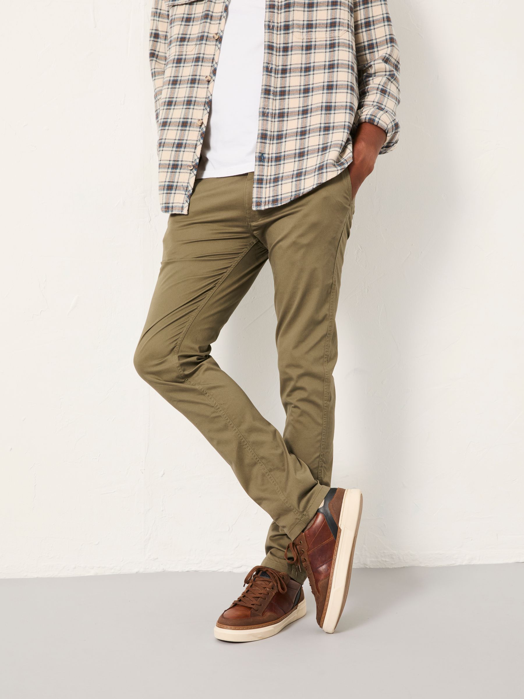 Made with lightweight yet hardwearing cotton with a touch of stretch for movement and comfort, these chinos are the perfect pair for casual days or dressing smart. In a comfortable slim fit, these simple trousers pack a big punch and boast plenty of pockets, belt loops and zip fly. Just pair with your go-to graphic T-Shirt, lightweight knit or relaxed sweatshirt.Breathable cottonPockets and belt loopsComfortable slim fitRegular inside leg length 31" / 79cm.Long inside leg length 33" / 84cm.