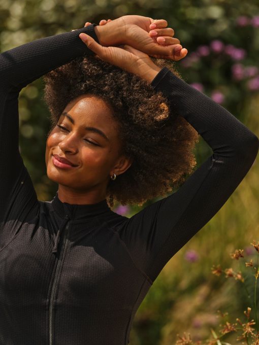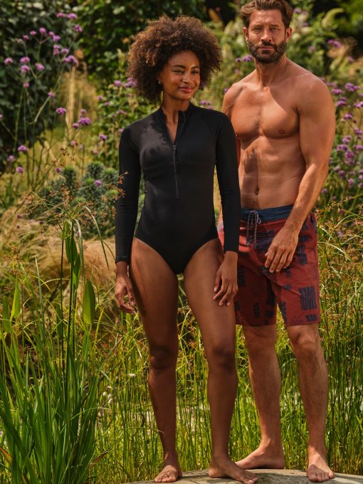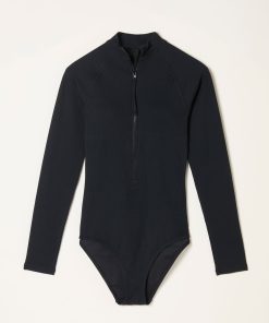 Stay protected and stylish in this long sleeve textured swimsuit. Made from a stretchy, textured fabric, it offers a sleek fit and added coverage. The front zip adds a sporty touch and adjustable comfort, making it perfect for active days at the beach or pool.