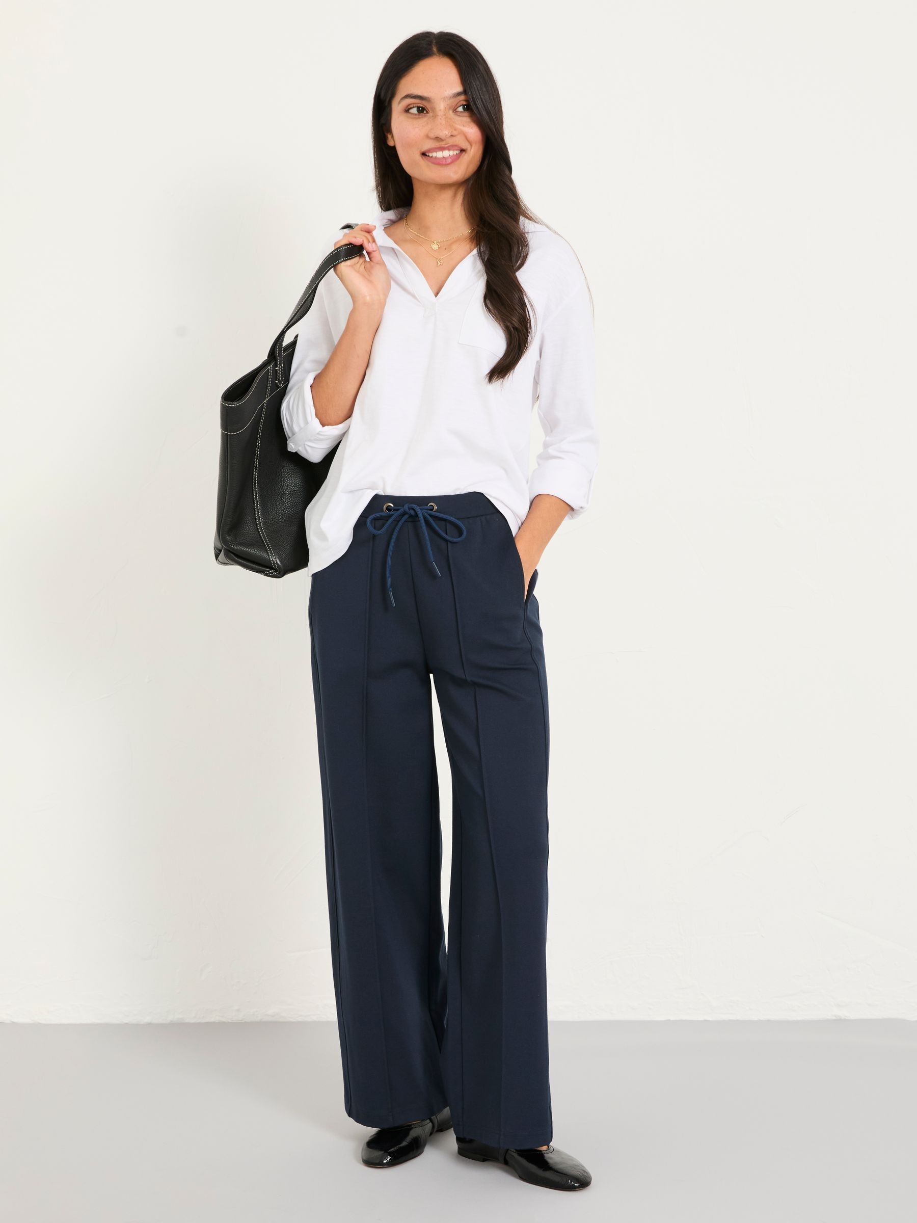 Looking for that perfect pair of trousers that are versatile and easy to style? Look no further. Our Ely wide leg trousers are the perfect mix of smart and casual. Their sleek silhouette makes them an effortless choice to look put together for dinner and drinks or office days, just pair with a blouse and some loafers. But their soft fabric makes them easy to dress down if paired with trainers and your favourite comfy sweatshirt. With a wide leg shape, these trousers offer a flattering fit while remaining lightweight and comfortable enough to wear all day.Model is 5’9”/175cm and wears UK size 8Short inside leg length 25" / 64cm.Regular inside leg length 27" / 69cm.Long inside leg length 29" / 74cm.
