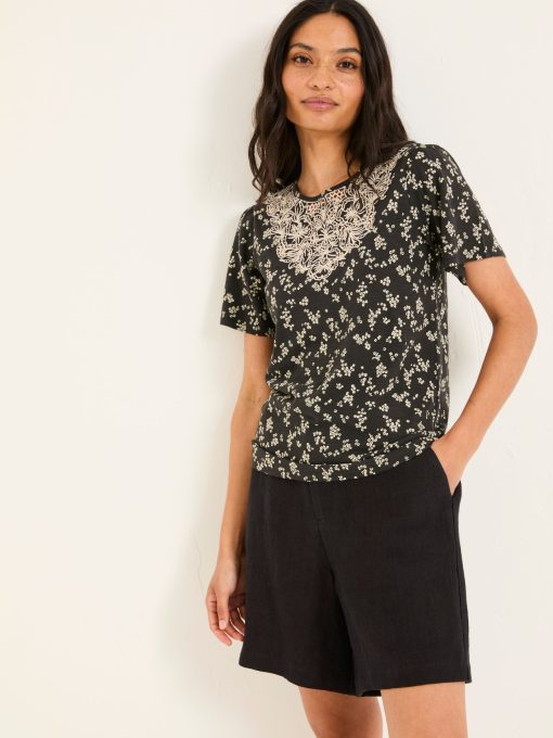 A fresh take on classic. Our Leoni mono ditsy t-shirt features a delicate patterned embroidery stitched across the front beautifully complemented by a subtle floral print. The perfect amount of texture and print that adds character to this everyday staple. Soft, breathable, and easy to wear its perfect for coffee runs, casual days out – effortlessly pairing with your favourite denim or go-to skirt.Model is 5’9”/175cm and wears UK size 8